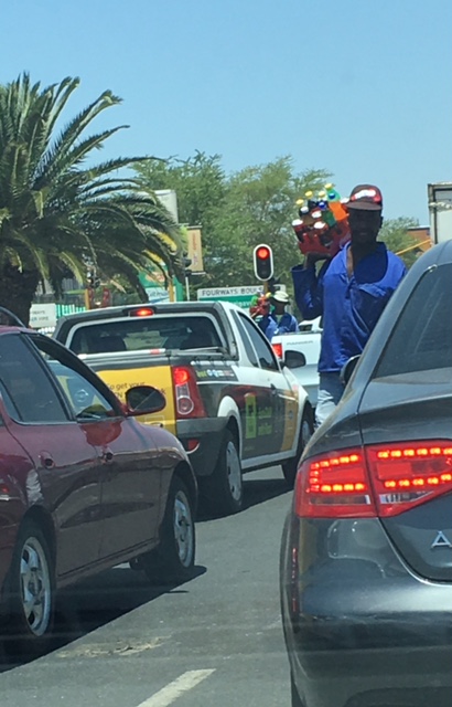 Hawkers. At nearly every robot (traffic light) when the light turns red, a bunch of guys walk out into the street among the stopped cars and try to sell things. I am often getting honked at by other drivers to move along when the light has changed because I am so busy watching the hawkers. Some of the items they sell sort of make sense and are things you might need while in your car. Things like sunglasses, soft drinks, car cell phone chargers, car air fresheners and newspapers. Other items I would be shocked to learn that anyone actually buys. Here are some of the things I have seen hawkers selling: